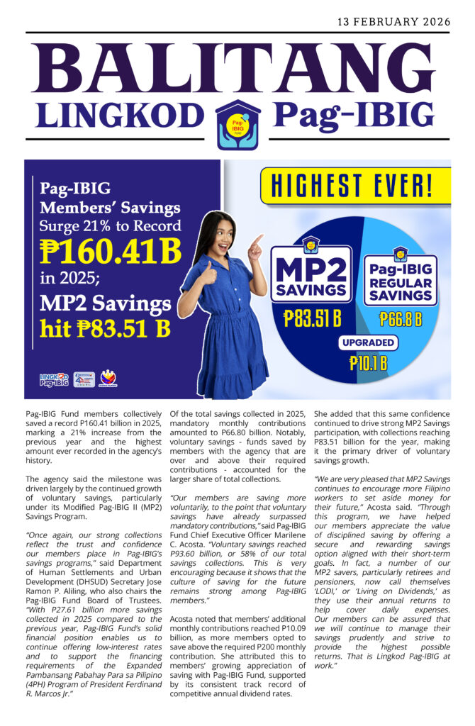 Pag-IBIG Fund members collectively saved a record P160.41 billion in 2025, making a 21% increase from the previous year and the highest amount ever recorded in the agencyโs history.
