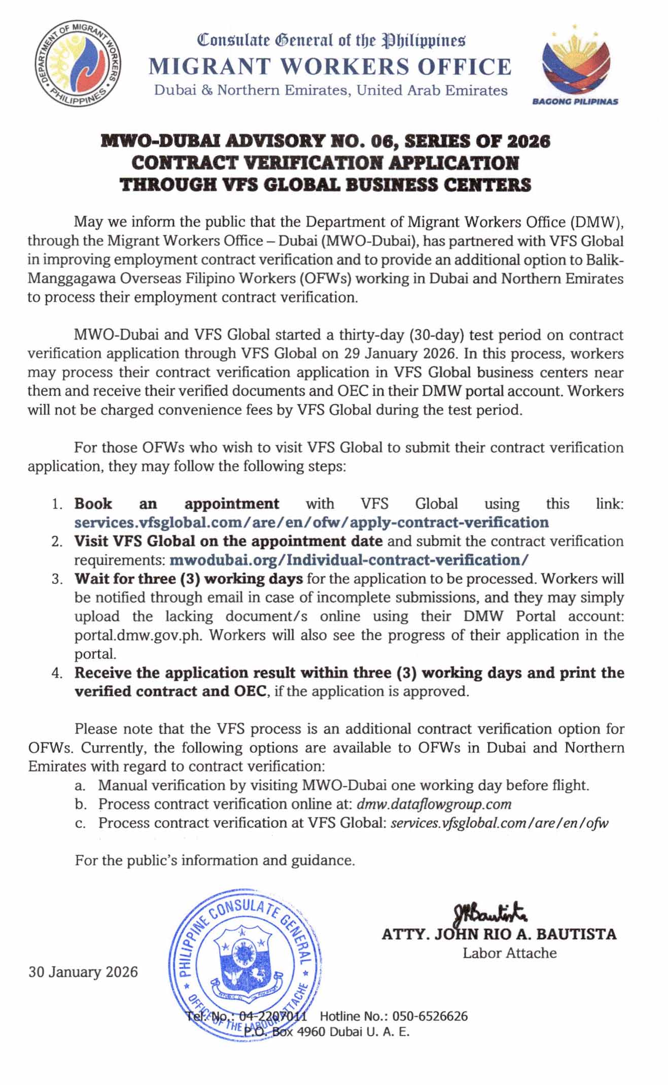 MWO-Dubai and VFS Global started a thirty-day (30-day) test period on contract verification application through VFS Global on 29 January 2026. In this process, workers may process their contract verification application in VFS Global business centers near them and receive their verified documents and OEC in their DMW portal account. Workers