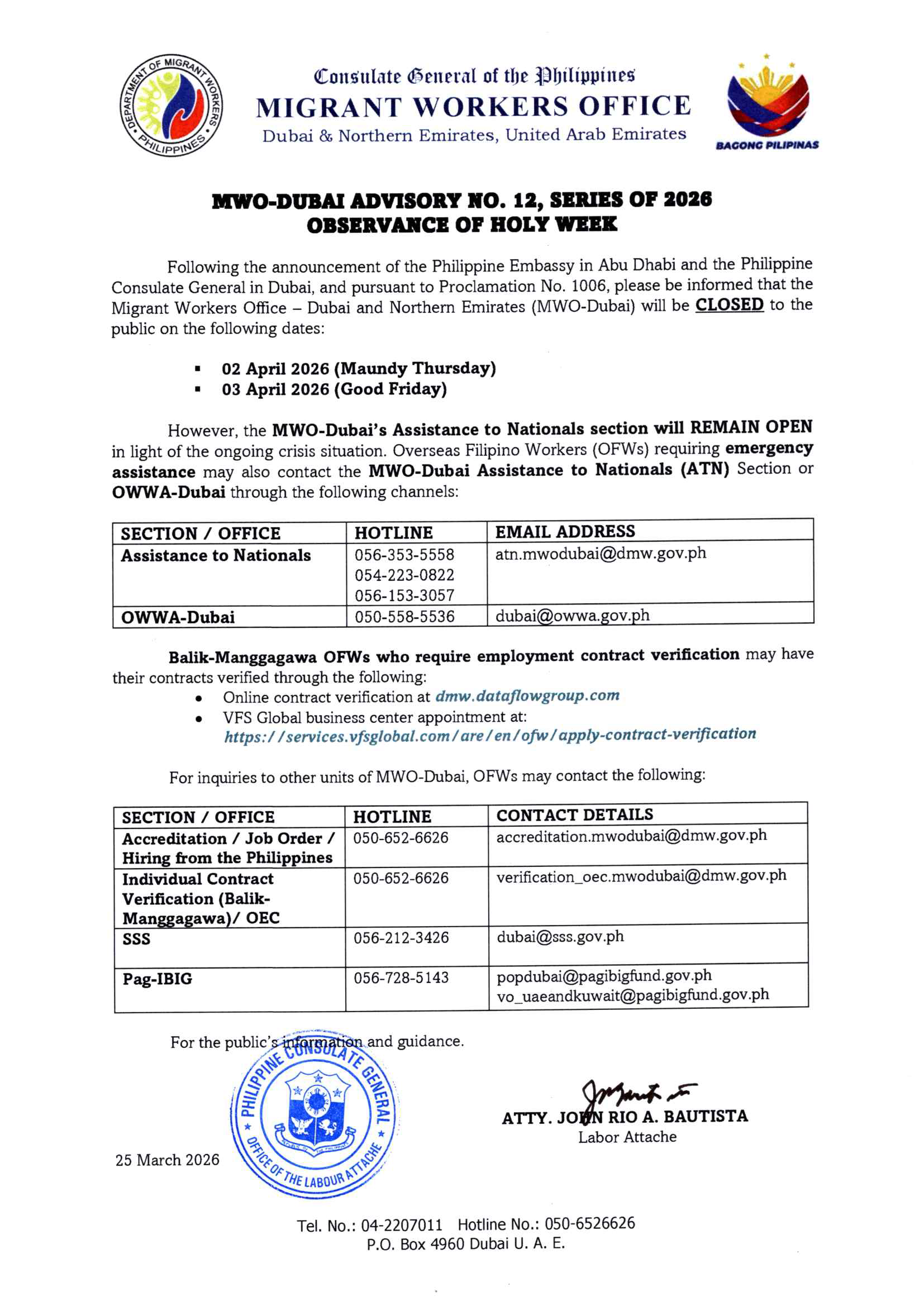 Following the announcement of the Philippine Embassy in Abu Dhbai and Philippine Consulate General in Dubai, and pursuant to Proclamation No. 1006, please be informed that the Migrant Workers Office – Dubai and Northern Emirates (MWO-Dubai) will be ๐๐๐๐๐๐ to the public on the following dates: