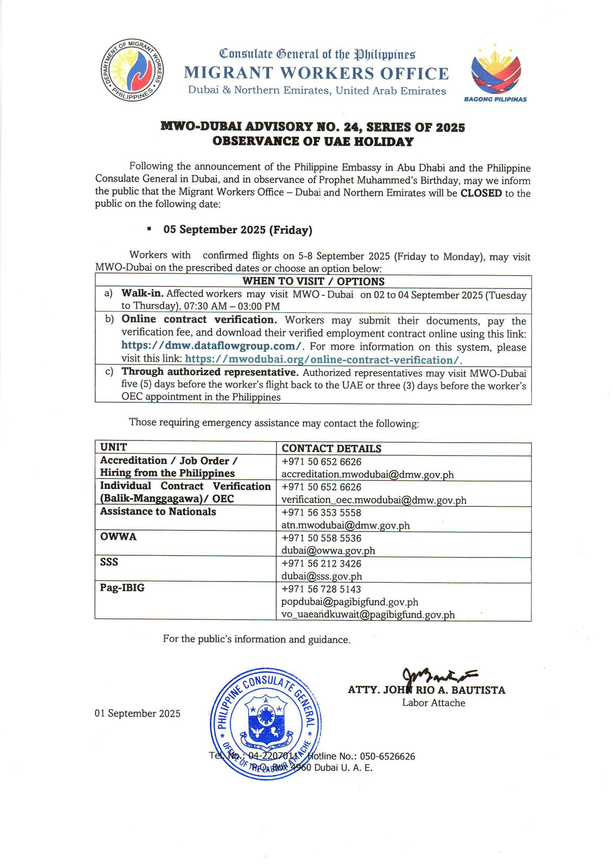 Following the announcement of the Philippine Embassy in Abu Dhabi and the Philippine Consulate General in Dubai, and in observance of Prophet Muhammed’s Birthday, may we inform the public that the Migrant Workers Office-Dubai and Northern Emirates will be ๐๐๐๐๐๐ to the public on the following date: