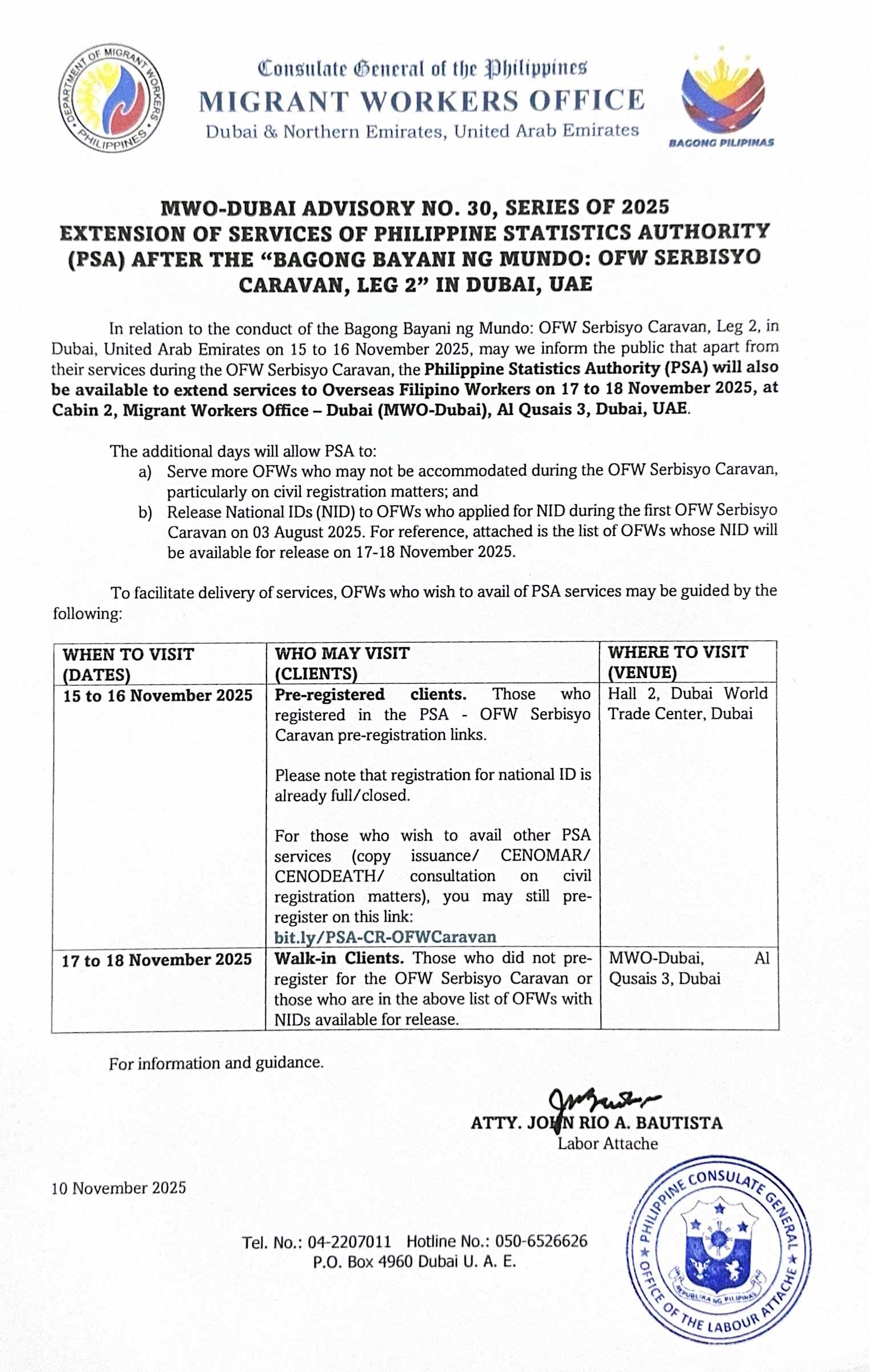 In relation to the conduct of the Bagong Bayani ng Mundo: OFW Serbisyo Caravan, Leg 2, in Dubai, United Arab Emirates on 15 to 16 November 2025, may we inform the public that apart from their services during the OFW Serbisyo Caravan, the ๐๐ก๐ข๐ฅ๐ข๐ฉ๐ข๐ง๐ ๐๐ญ๐๐ญ๐ข๐ฌ๐ญ๐ข๐๐ฌ ๐๐ฎ๐ญ๐ก๐จ๐ซ๐ข๐ญ๐ฒ (๐๐๐) ๐ฐ๐ข๐ฅ๐ฅ ๐๐ฅ๐ฌ๐จ ๐๐ ๐๐ฏ๐๐ข๐ฅ๐๐๐ฅ๐ ๐ญ๐จ ๐๐ฑ๐ญ๐๐ง๐ ๐ฌ๐๐ซ๐ฏ๐ข๐๐๐ฌ ๐ญ๐จ ๐๐ฏ๐๐ซ๐ฌ๐๐๐ฌ ๐