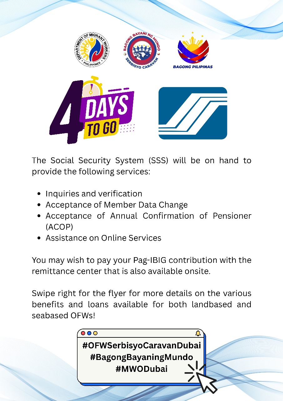 The Dubai leg of the Caravan brings together PhilHealth, PSA, PAO, DSWD, DTI-PTIC Dubai, Pag-IBIG Fund, SSS, OWWA, PCG Dubai and MWO Dubai.