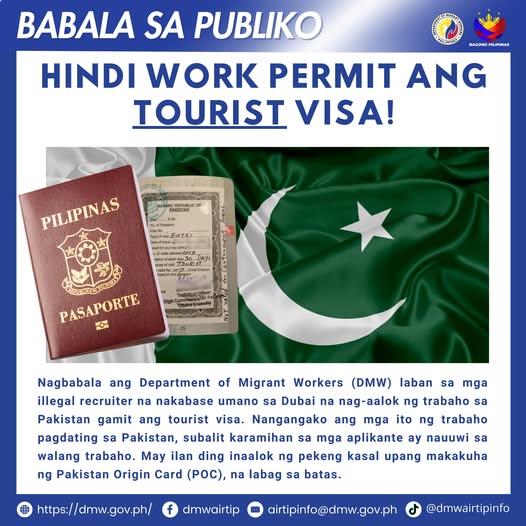 Nagbabala ang Department of Migrant Workers (DMW) laban sa mga illegal recruiter na nakabase umano sa Dubai na nag-aalok ng trabaho sa Pakistan gamit ang tourist visa. Nangangako ang mga ito ng trabaho pagdating sa Pakistan, subalit karamihan sa mga aplikante ay nauuwi sa walang trabaho. May ilan ding inaalok ng pekeng kasal upang makakuha ng Pakistan Origin Card (POC), na labag sa batas.