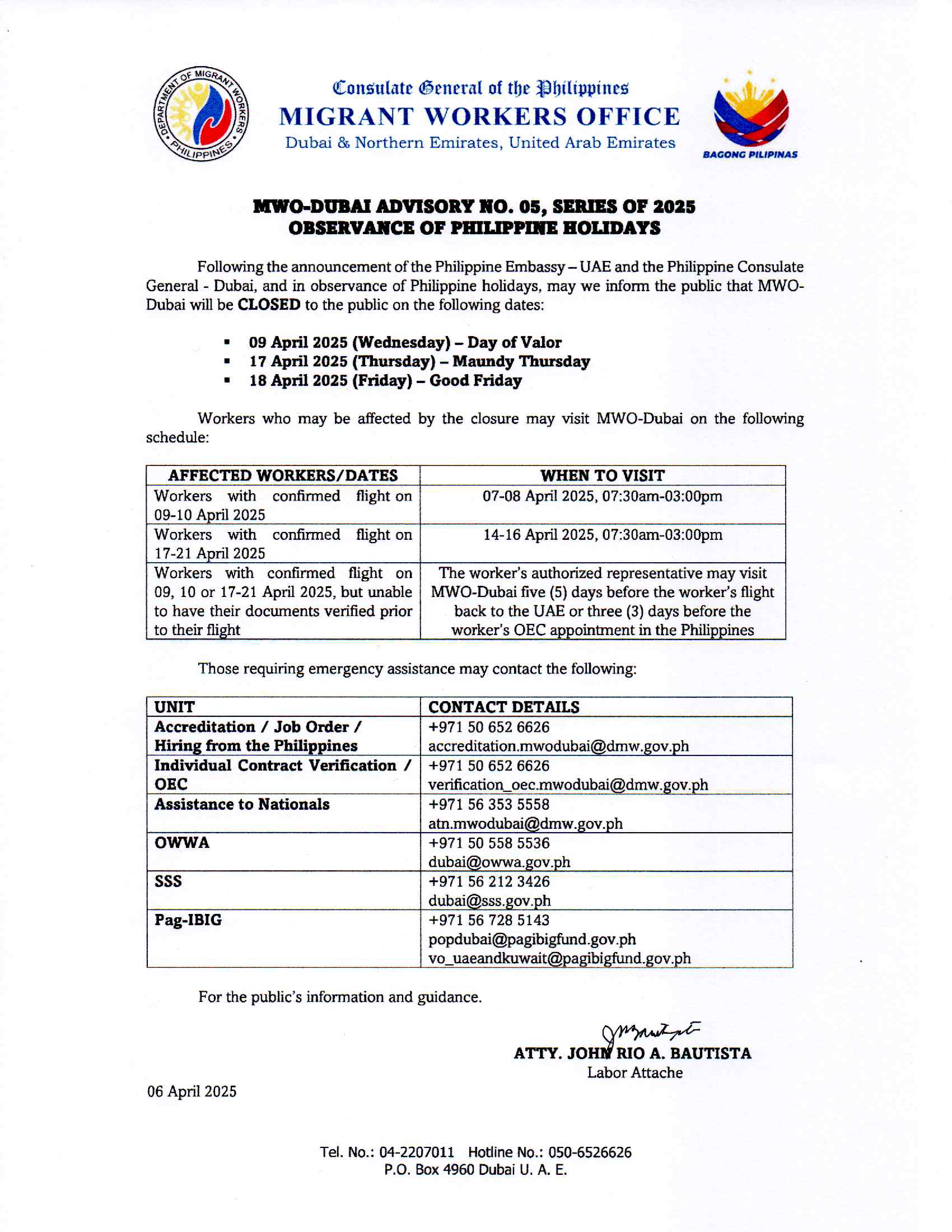 Following the announcement of the Philippine Embassy – UAE and the Philippine Consulate General – Dubai, and in observance of the Philippine Holiday, may we inform the public that MWO Dubai will be CLOSED to the public on the following dates.