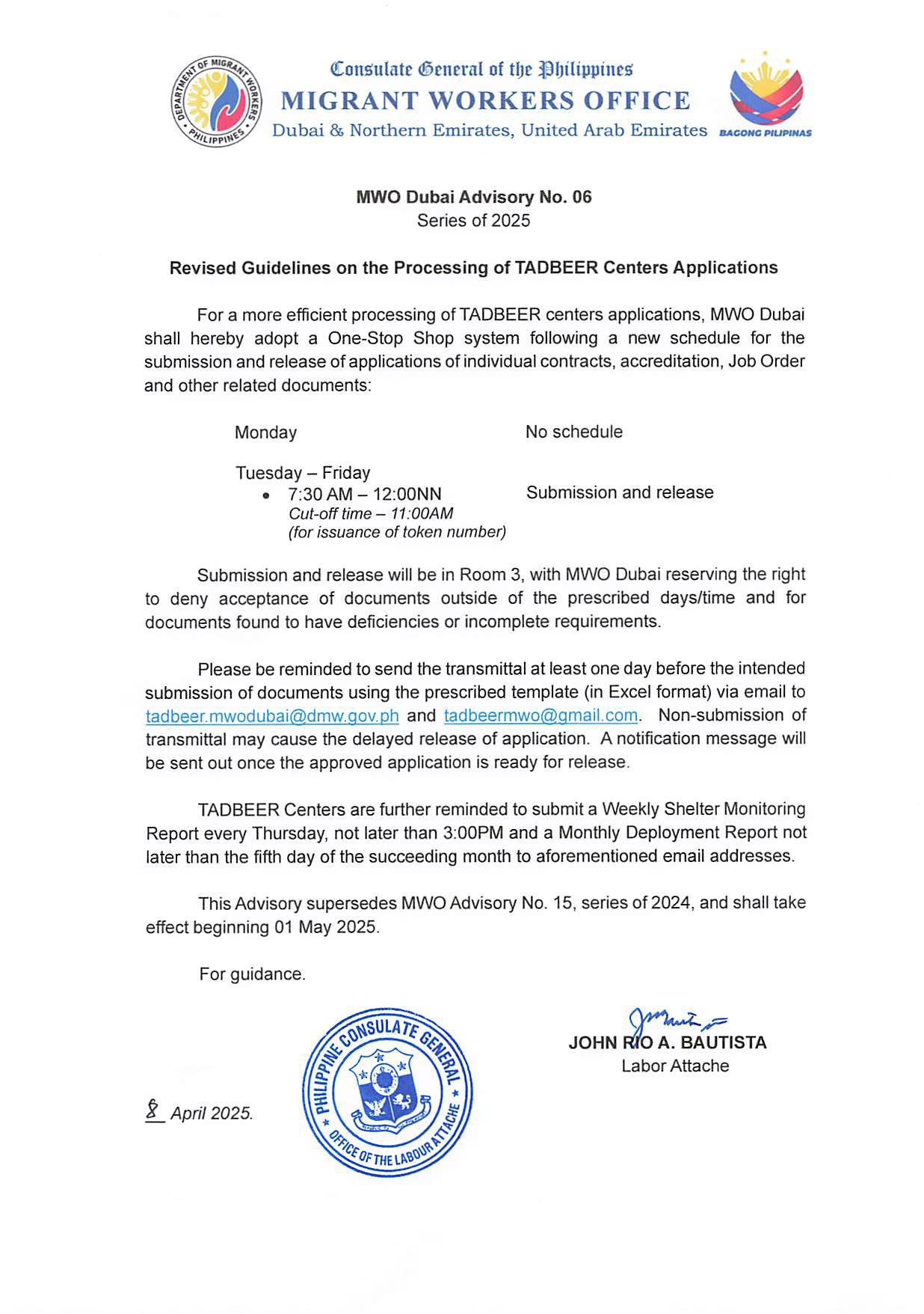 For a more efficient processing of TADBEER centers applications, MWO Dubai shall herbey adopt a One-Stop Shop systems following a new schedule for the submission and release of applications of individual contracts.