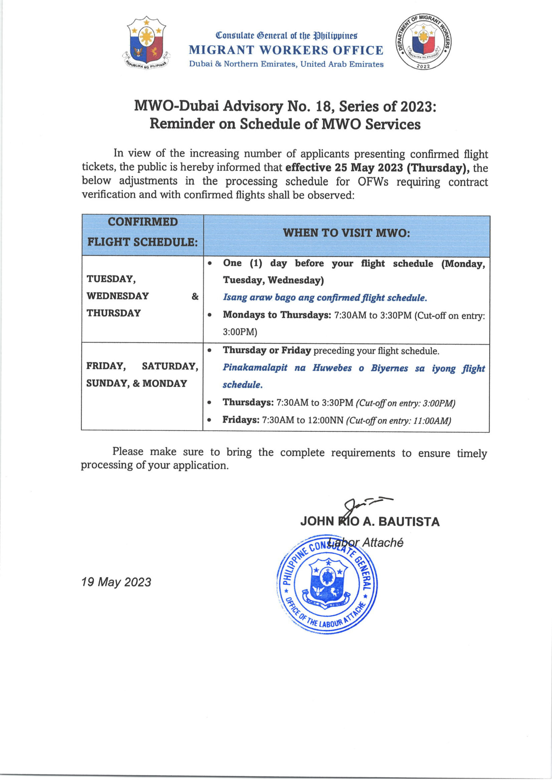 In view of the increasing number of applicants presenting confirmed flight tickets, the public is hereby informed that effective 25 May 2023 (Thursday), the below adjustments in the processing schedule for OFWs requiring contract verification and with confirmed flights shall be observed: