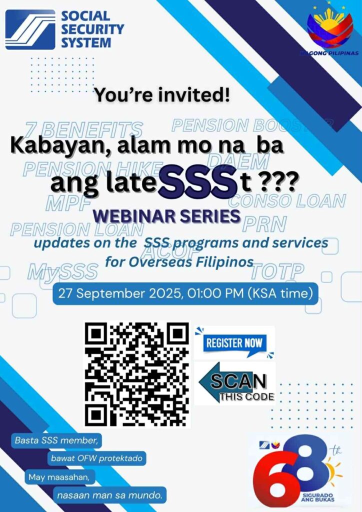 The Middle East Operations Division of the Social Security System (SSS) invites our Overseas Filipino Workers (OFWs) in the United Arab Emirates to a special webinar on 27 September 2025 at 02:00 PM (UAE time).
