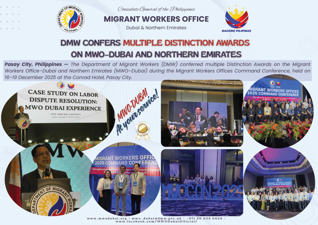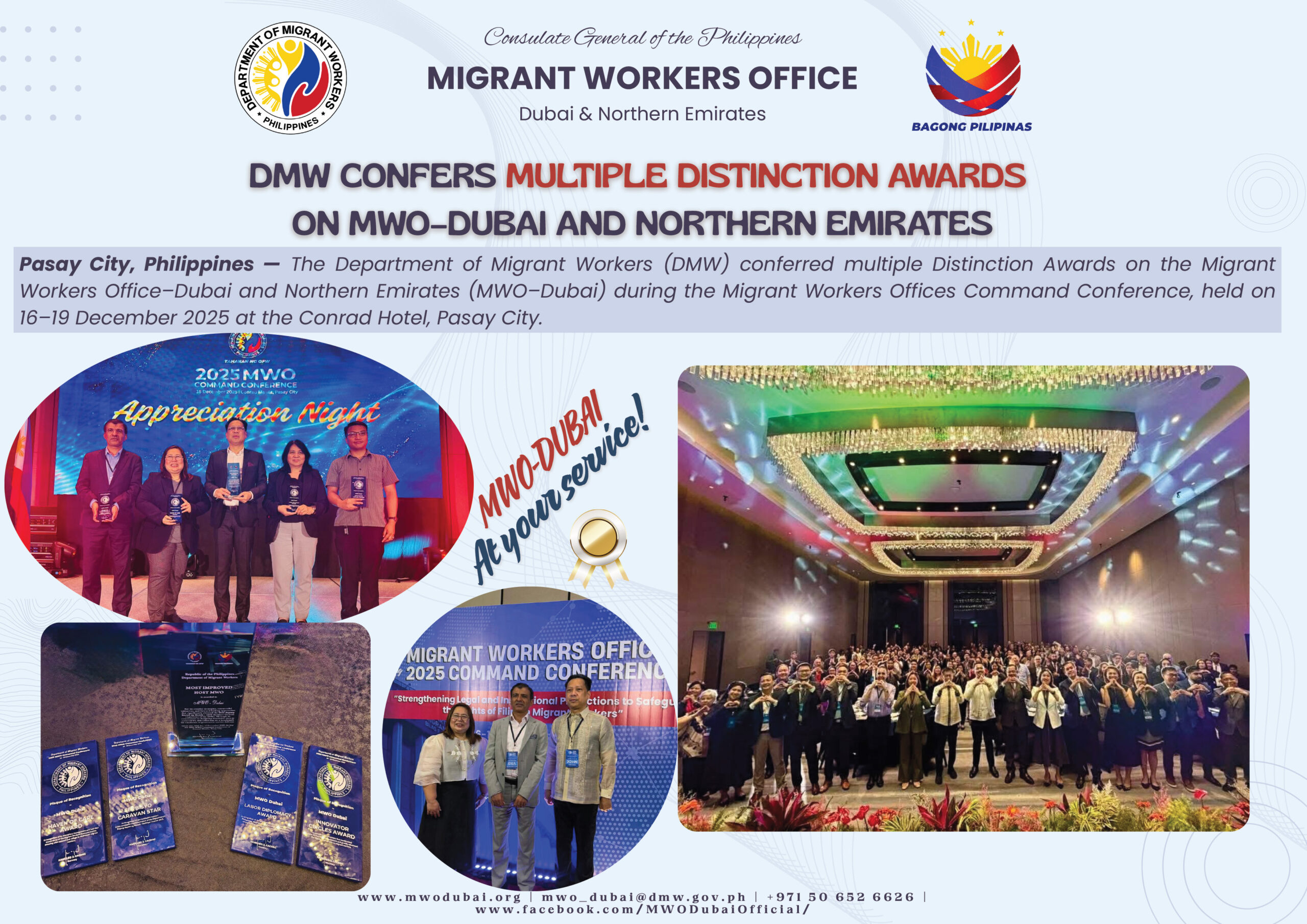 MWOโDubai was recognized with the ๐๐๐ซ๐๐ข๐ฌ๐ฒ๐จ ๐๐๐ซ๐๐ฏ๐๐ง ๐๐ญ๐๐ซ for its invaluable support to the Bagong Bayani ng Mundo โ Serbisyo Caravan 2025; the ๐๐๐ฏ๐๐ง ๐จ๐ ๐๐๐ซ๐ ๐๐ฐ๐๐ซ๐ for exemplary management of the Migrant Workers Resource Center; and the ๐๐ง๐ง๐จ๐ฏ๐๐ญ๐จ๐ซ ๐๐ข๐ซ๐๐ฅ๐๐ฌ ๐๐ฐ๐๐ซ๐ for modernizing service delivery, particularly through the Online Employment Contract Verification System in partnership with the DataFlow Group.โฃ