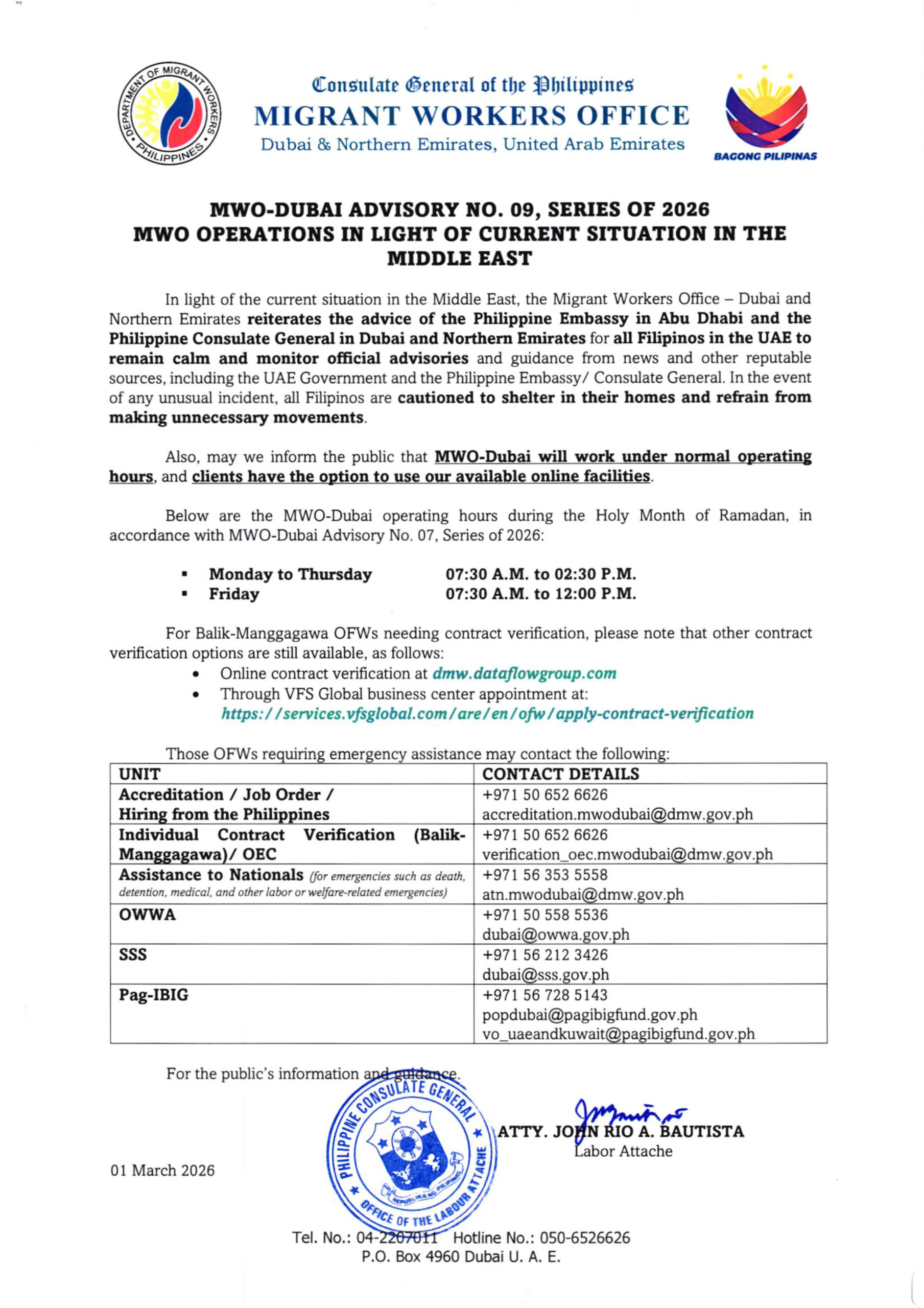 Below are the MWO-Dubai operating hours during the Holy Month of Ramadan, in accordance with MWO-Dubai Advisory No. 07, Series of 2026:โฃ