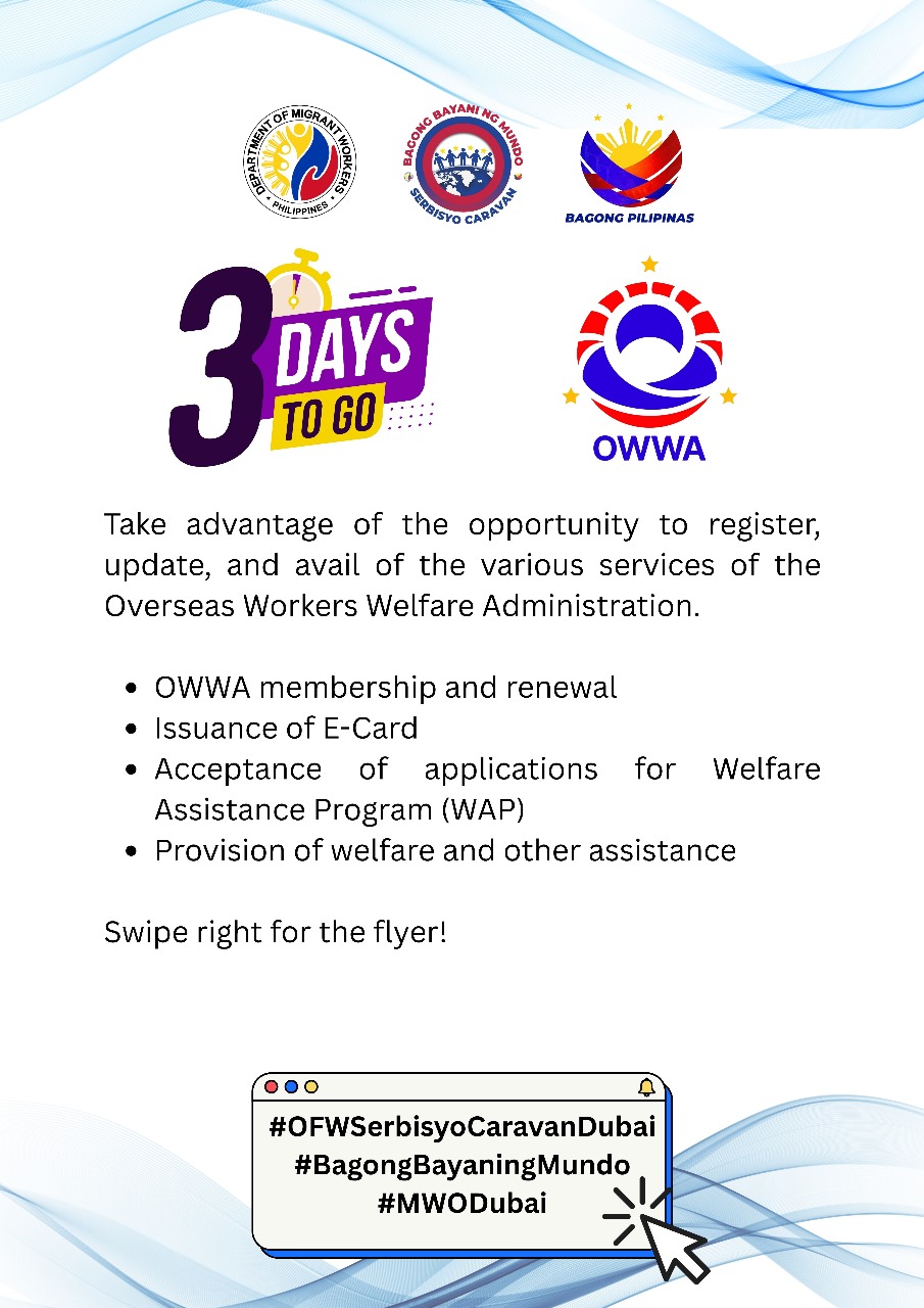 The Dubai leg of the Caravan brings together PhilHealth, PSA, PAO, DSWD, DTI-PTIC Dubai, Pag-IBIG Fund, SSS, OWWA, PCG Dubai and MWO Dubai.