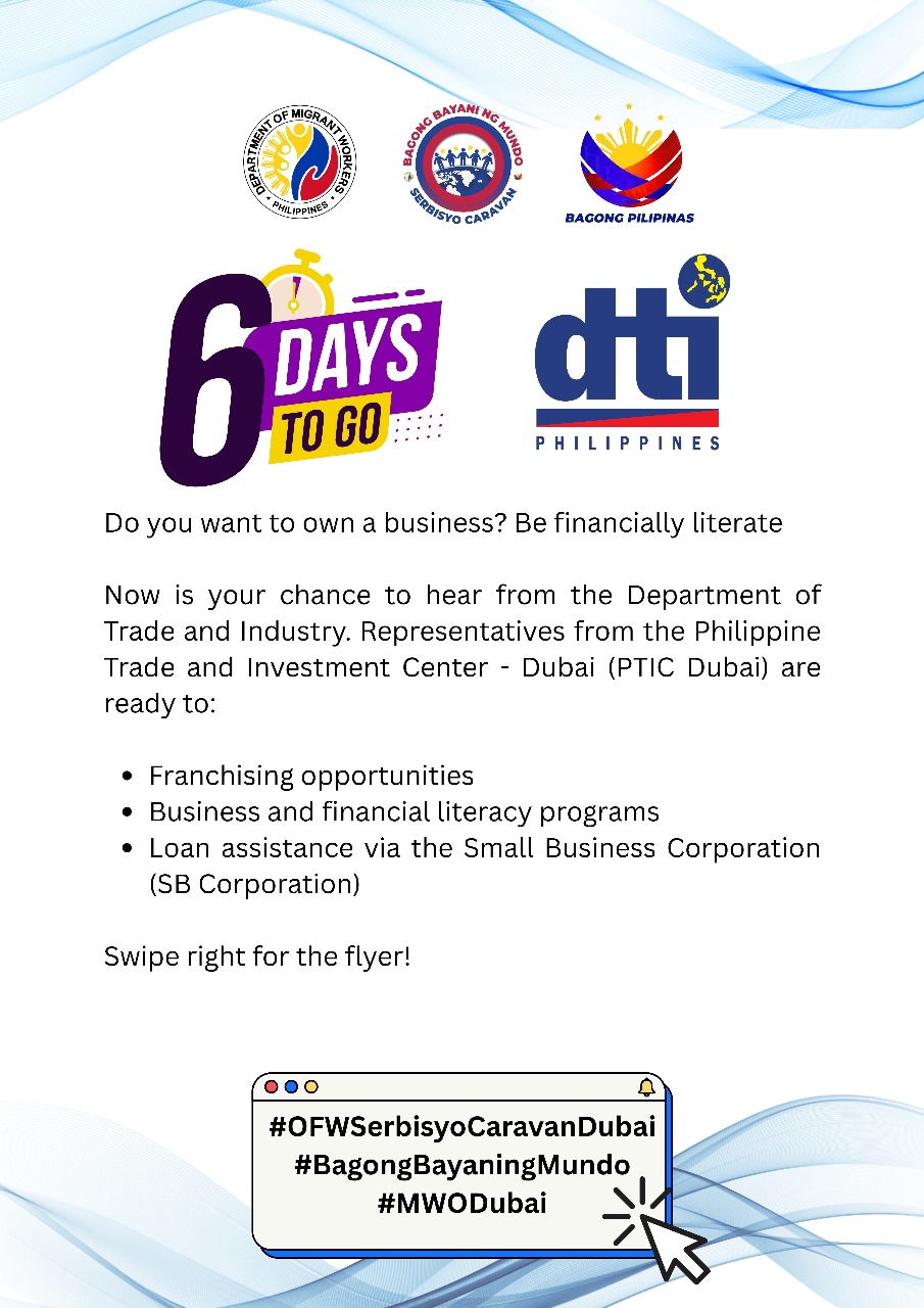 The Dubai leg of the Caravan brings together PhilHealth, PSA, PAO, DSWD, DTI-PTIC Dubai, Pag-IBIG Fund, SSS, OWWA, PCG Dubai and MWO Dubai.