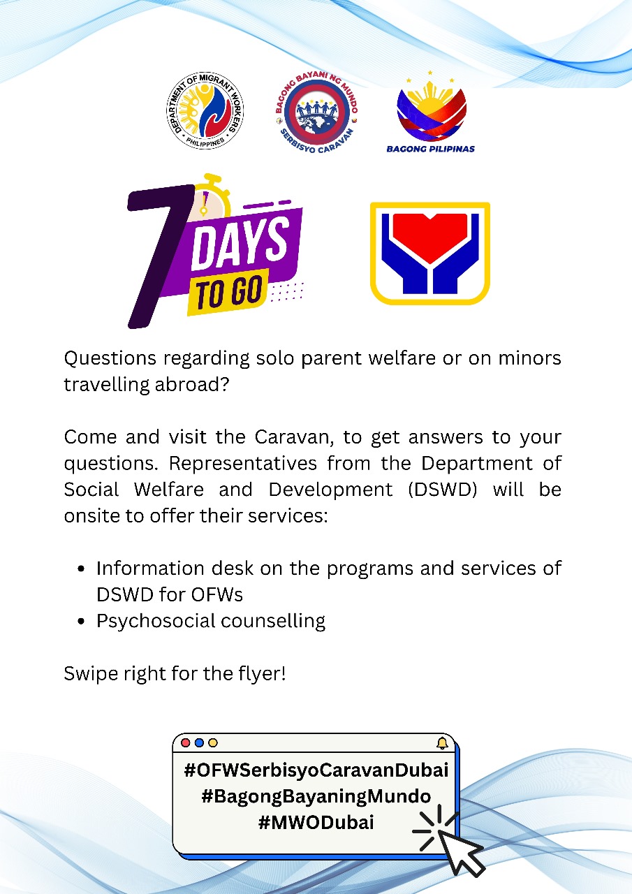 The Dubai leg of the Caravan brings together PhilHealth, PSA, PAO, DSWD, DTI-PTIC Dubai, Pag-IBIG Fund, SSS, OWWA, PCG Dubai and MWO Dubai.
