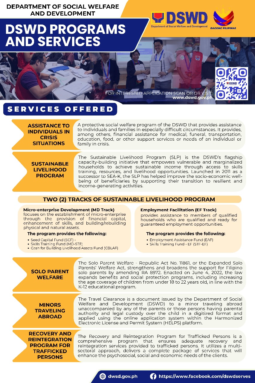 Come and visit the Caravan, to get answers to your questions. Representatives from the Department of Social Welfare and Development (DSWD) will be onsite to offer their services: