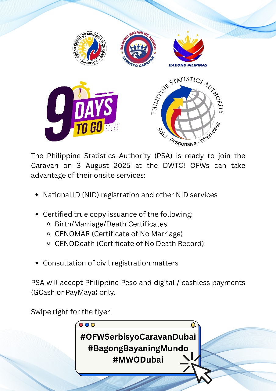 The Dubai leg of the Caravan brings together PhilHealth, PSA, PAO, DSWD, DTI-PTIC Dubai, Pag-IBIG Fund, SSS, OWWA, PCG Dubai and MWO Dubai.