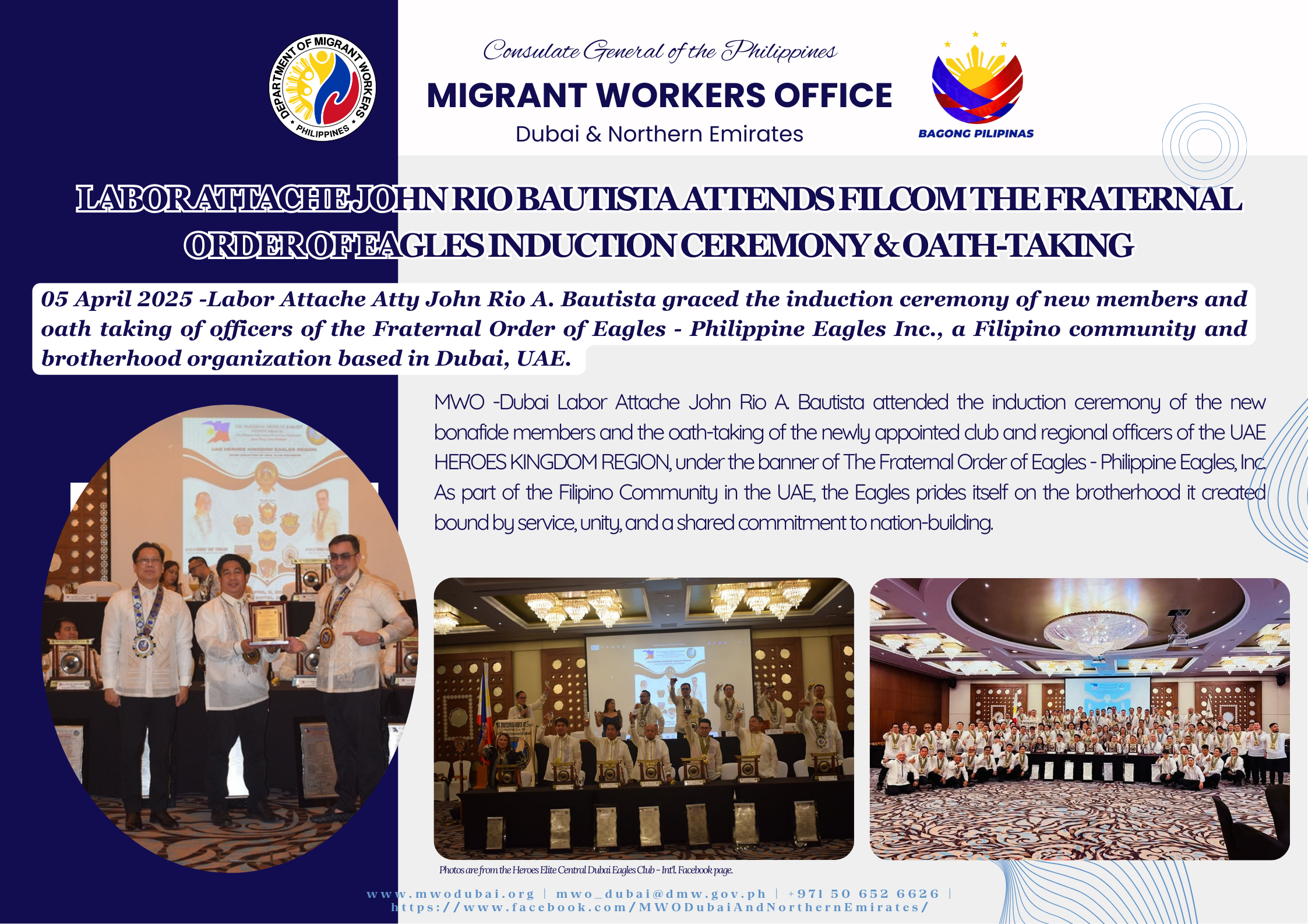 05 April 2025 – Labor Attache Atty John Rio A. Bautista graced the induction ceremony of new members and oath taking of officers of the Fraternal Order of Eagles – Philippine Eagles Inc., a Filipino community and brotherhood organization based in Dubai, UAE.