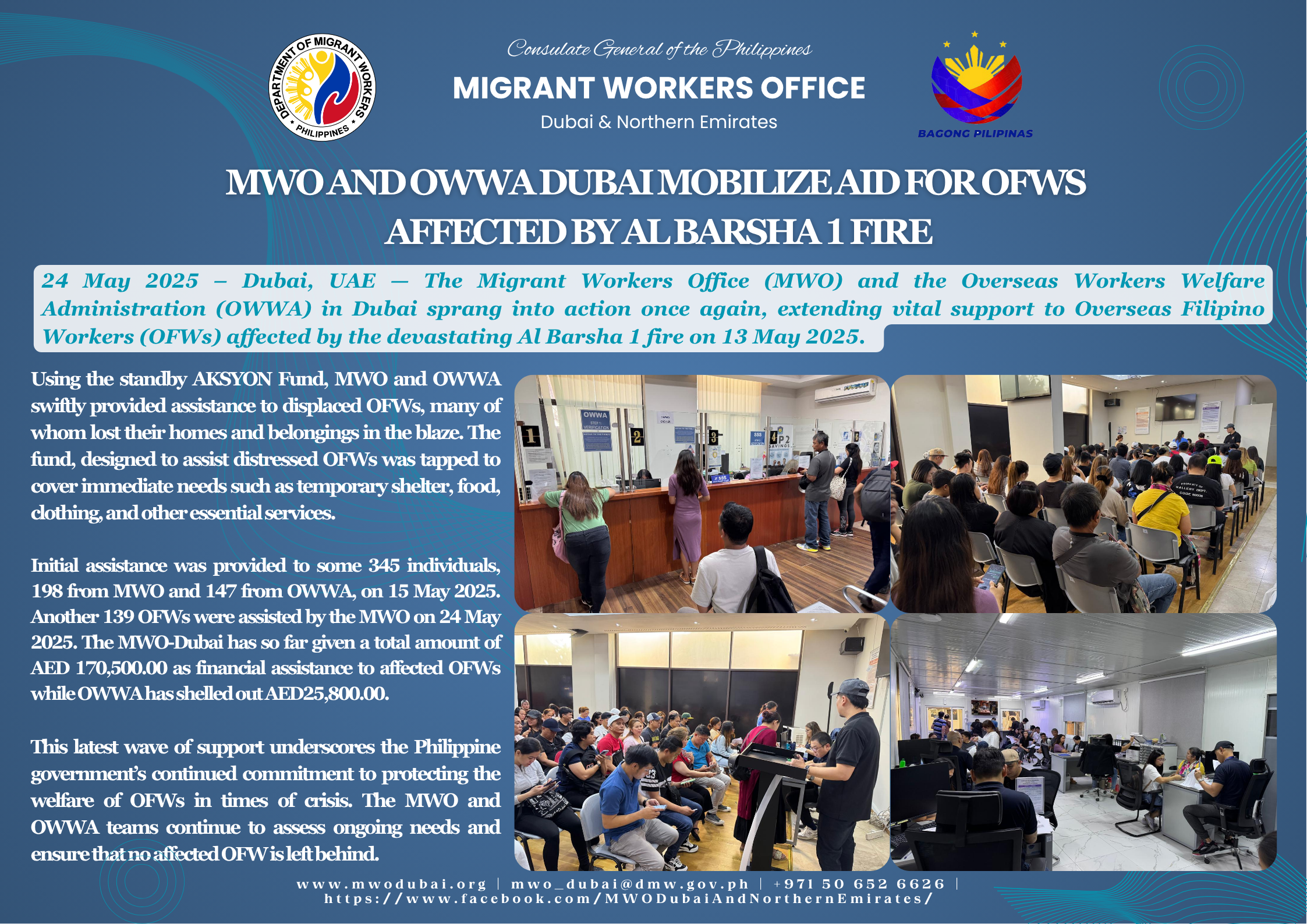24 May 2025 – Dubai, UAE – The Migrant Workers Office (MWO) and the Overseas Workers Welfare Administration (OWWA) in Dubai sprang into action once again, extending vital support to Overseas Filipino Workers (OFWs) affected by the devastating Al Barsha 1 fire on 13 May 2025.