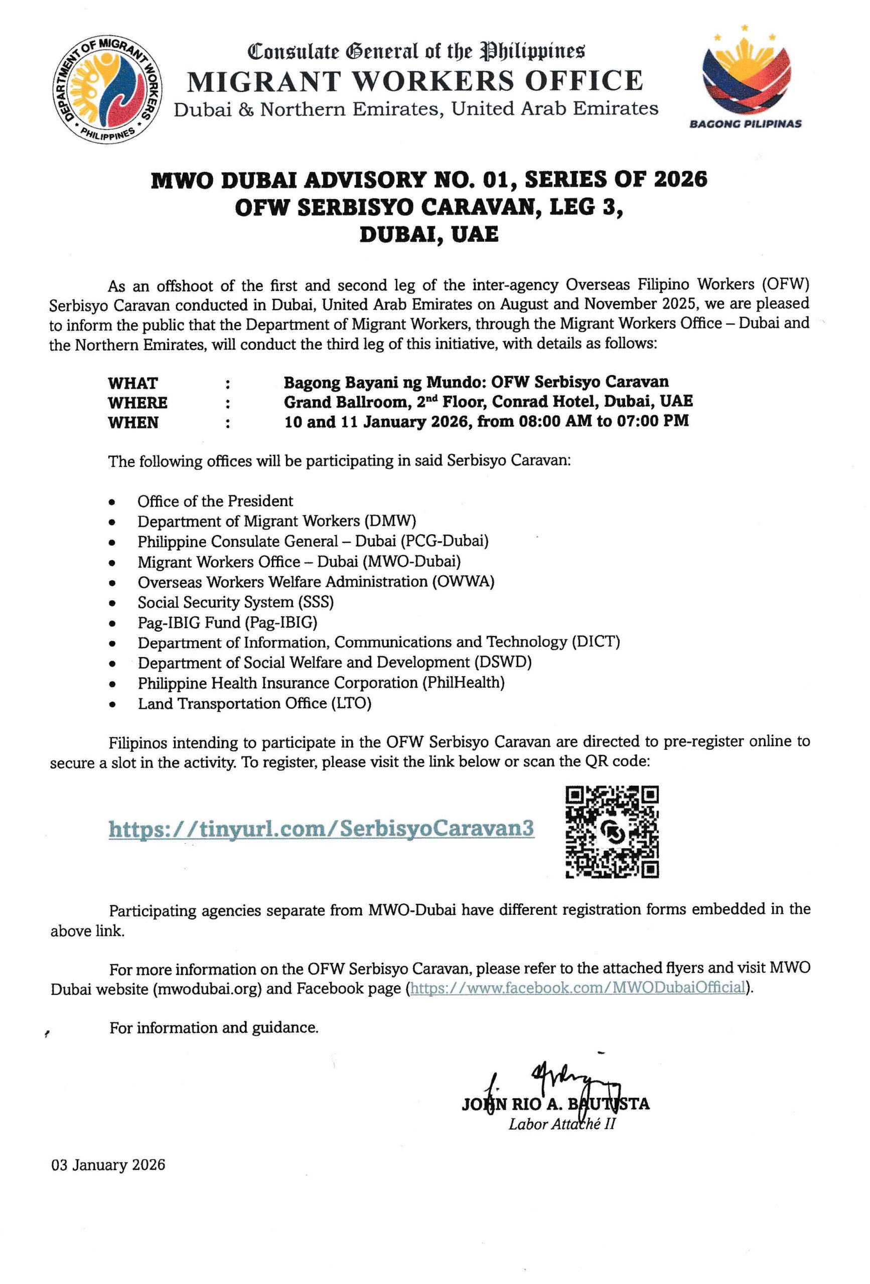 As an offshoot of the first and second leg of the inter-agency Overseas Filipino Workers (OFW) Serbisyo Caravan conducted in Dubai, United Arab Emirates on August and November 2025, we are pleased to inform the public that the Department of Migrant Workers, through the Migrant Workers Office-Dubai and then Northern Emirates, will conduct the third leg of this initiative, with details as follows: