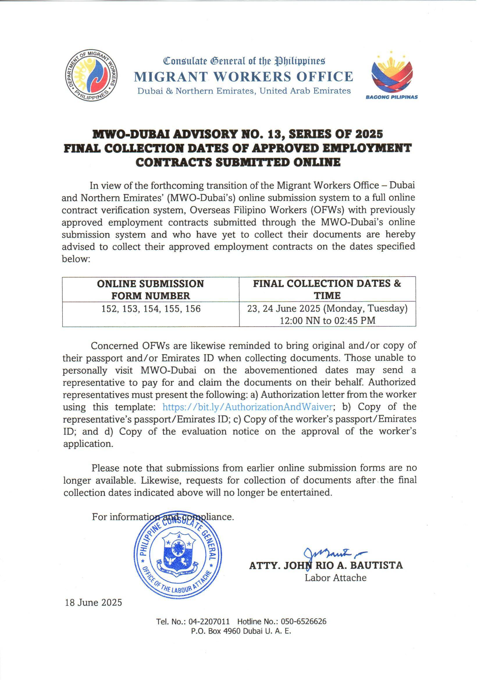 In view of the forthcoming transition of the Migrant Workers Office – Dubai and Northern Emirates’ (MWO-Dubai’s) online submission system to a full online contract verification system, Overseas Filipino Workers (OFWs) with previously approved employment contracts submitted through the MWO-Dubai’s online submission system and who have yet to collect their documents are hereby advised to collect their approved employment contracts on the dates specified below: