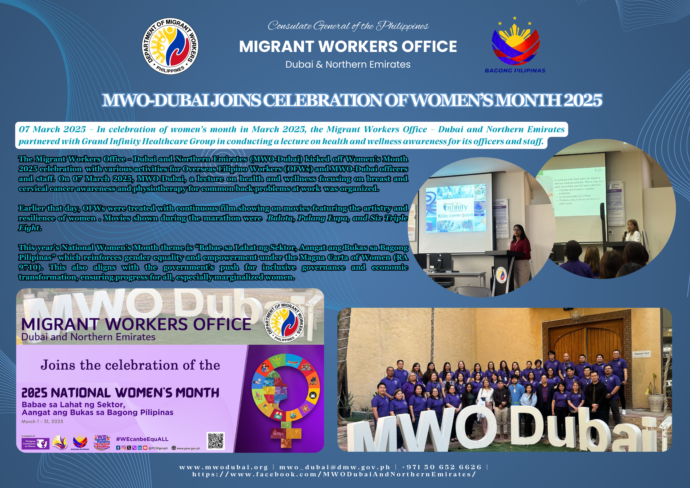 07 March 2025 – In celebration of women’s month in March 2025, the Migrant Workers Office – Dubai and Northern Emirates partnered with Grand Infinity Healthcare Group in conducting a lecture on health and wellness awareness for its officers and staff.