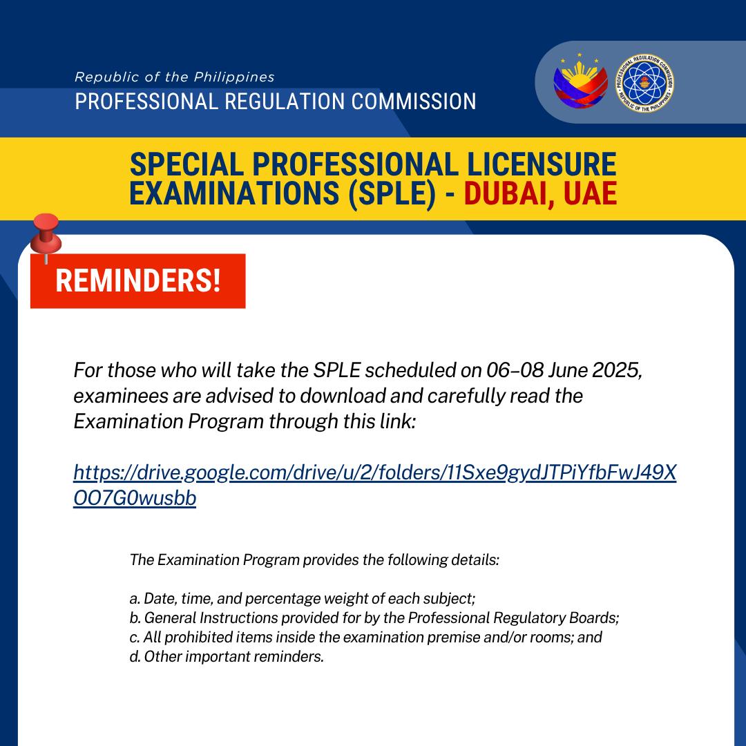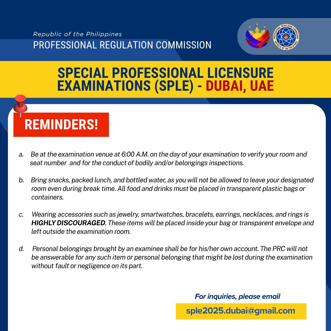 The Professional Regulation Commission and the Migrants Workers Office – Dubai and Northern Emirates inform the June 2025 SPLE examinees in Dubai, UAE of the following reminders: